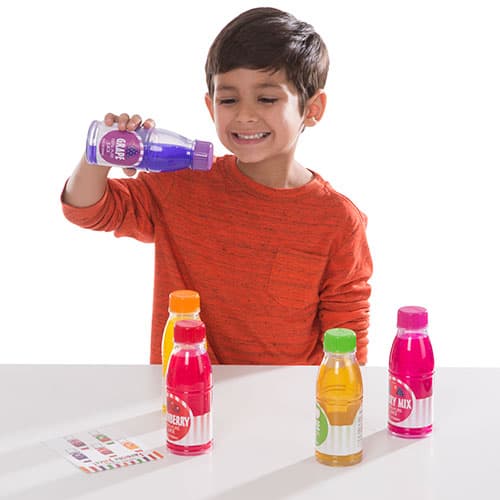 The Melissa & Doug® Tip & Sip Toy Juice bottles are perfect for pretending to pour refreshing drinks, and watch as the liquid in these five durable plastic juice bottles “disappears”! This set comes with grape, orange, cranberry, apple, and berry mix bottles and the reusable menu card lets kids place orders and they offer creative combinations to spark play ideas. Not only will this play set quench a thirst for pretend play, it promotes early learning skills like color recognition, language, sensory development, and more. Dimensions: 13”H x 8.8”W x 2.8”D.