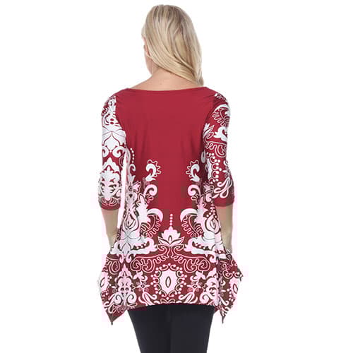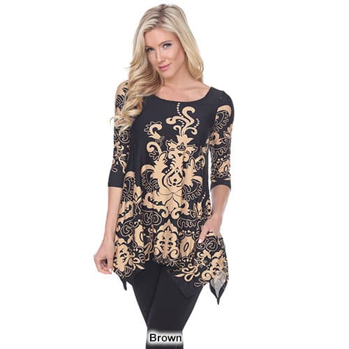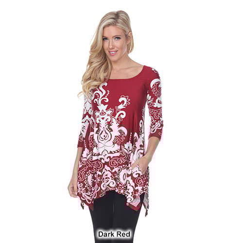 This Womens White Mark Yanette tunic is a comfortable and stylish design that drapes over your body. Its bold and chic print features 3/4 length sleeves and a scoop-neckline. This top is a definite must have for your everyday wardrobe.