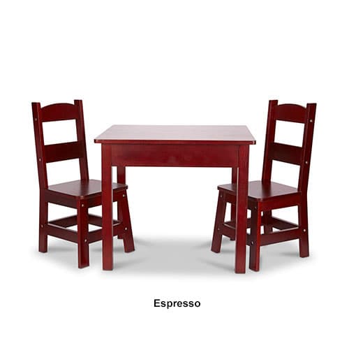 Description The Melissa & Doug® Wooden table and chairs are sized just right for kids, but strong enough to hold moms and dads too! This hardwood table and chairs set has a...