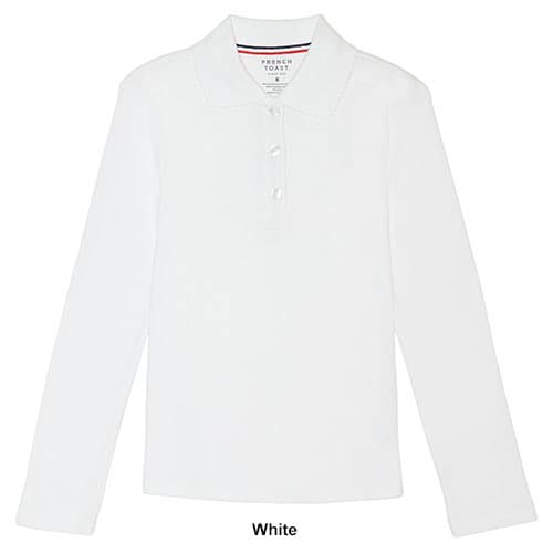 Girls (7-16) long sleeve three button closure interlock polo. 60% Cotton, 40% Polyester. Machine wash. Tumble dry.