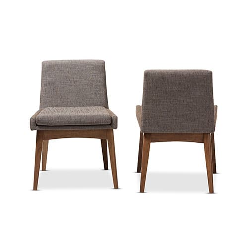 The Baxton Studio Nexus 2-piece upholstered dining side chair set features a solid wood frame in walnut finishing and upholstered in cotton fabric. The comfortable foam padded seat and back promote lasting comfort. The taper look continues down to the splayed leg design for a modern aesthetic. Spot clean only. Materials: 100% Polyester, rubberwood, MDF and foam. Dimensions: 29.92”H x 21.46”W x 17.64”D.