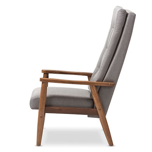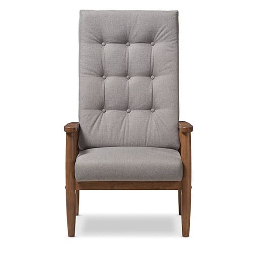 The Baxton Studio Roxy utton-tufted high-back chair features seat back is accented with buttons for classic aesthetic and is double-cushioned to promote ultimate relaxation. The splayed legs and clean lines add a retro modern feel. This light weight chair uses rubberwood for easy handling. Spot clean only. Materials: 100% Polyester, wood and foam. Dimensions: 45.67”H x 27.36”W x 34.25”D.
