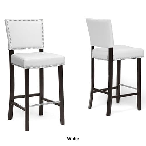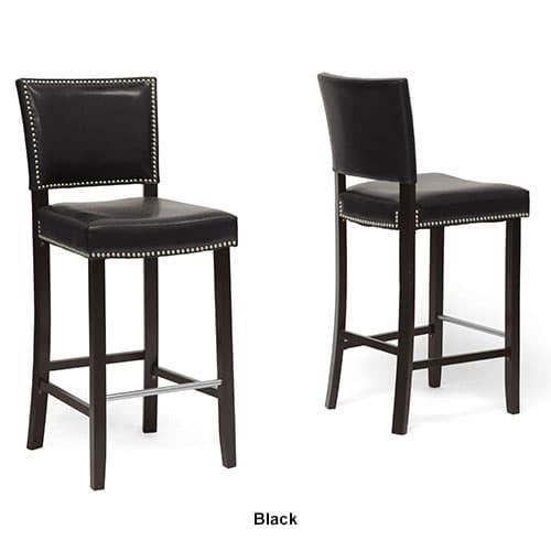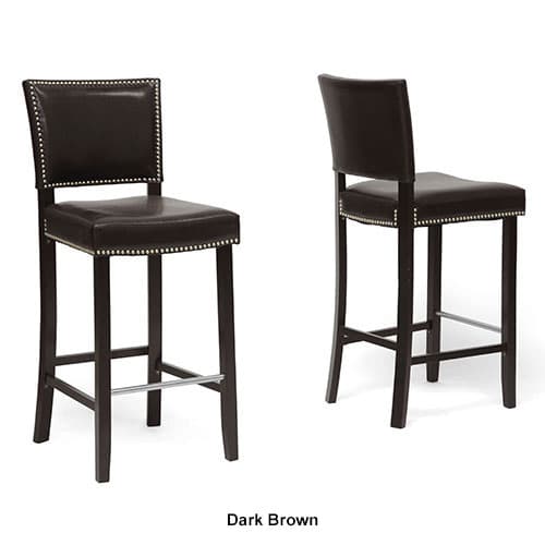 Description The Baxton Studio Aries 2-piece bar stool set features silver nail head trim, a solid rubber wood frame, a stainless steel foot rest, non-marking feet, and foam...
