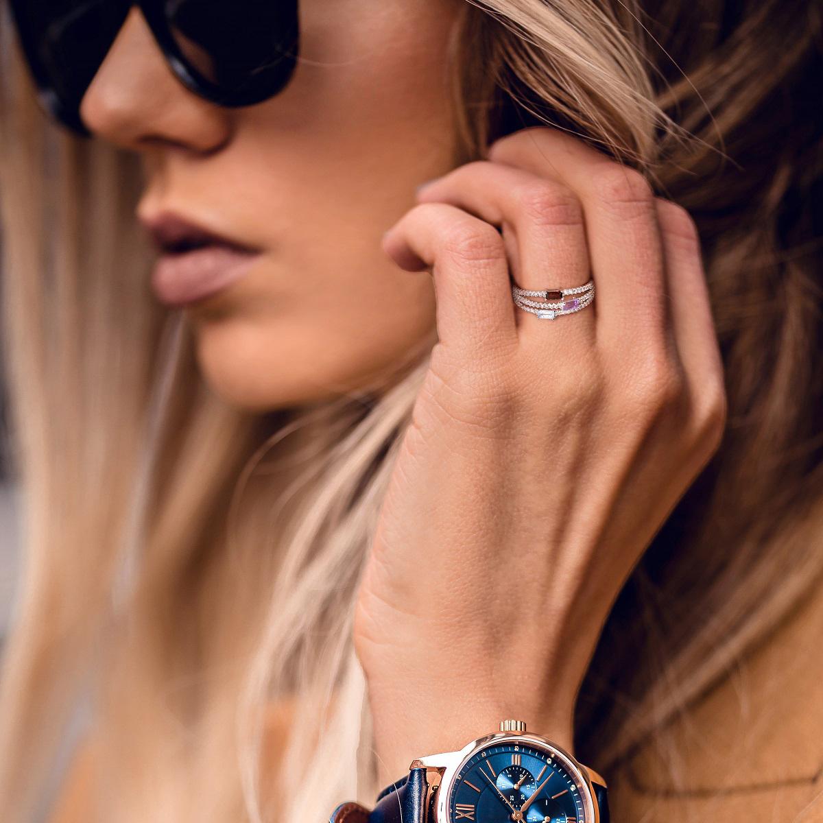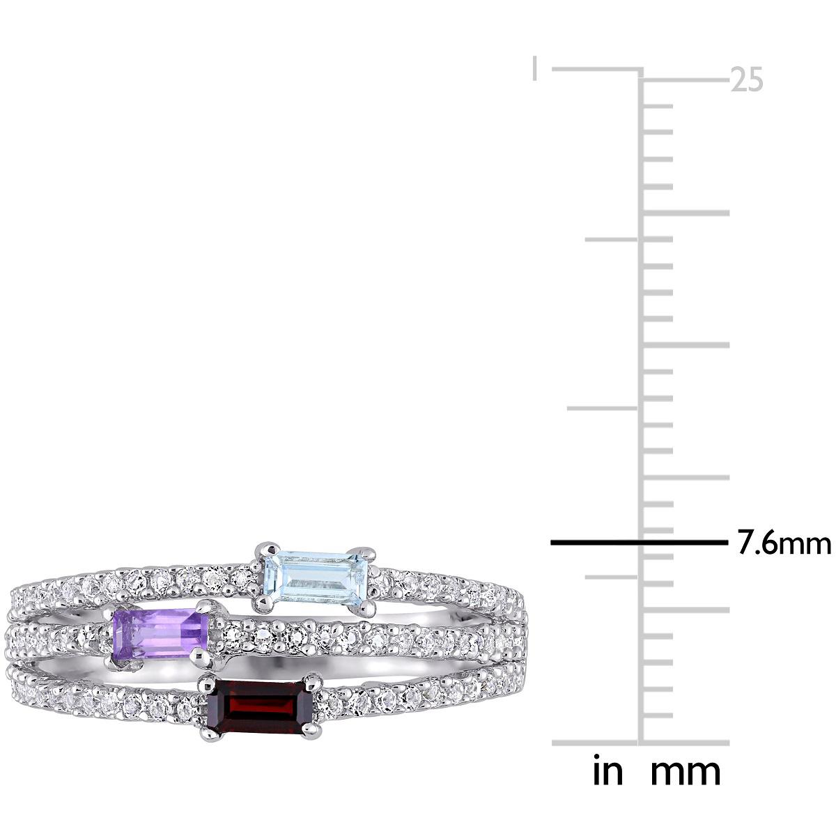 This radiant Gemstone Classics™ multi-row anniversary ring is crafted in lustrous sterling silver. This split shank wedding ring features a baguette-cut sky blue topaz, amethyst, and garnet gemstones along with 73 round-cut white topaz gemstones beautifully embellished on the band.