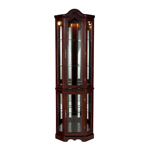 The Southern Enterprises lighted corner curio cabinet features an upper cabinet with one 25 watt, type F light bulb and 9ft. power cord included, a mirrored back and 2 adjustable glass shelves to display your collectibles. There is a base cabinet that contains 1 adjustable glass shelf. The golden oak finish with antique hardware will become a cherished piece of furniture in your home. Anti-tipping hardware is included for maximum stability. Each shelf supports up to 10 pounds. Materials: Birch, MDF, veneer, tempered glass, mirror and metal.