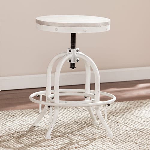 The Southern Enterprises Industrial adjustable swivel stool features a shiplap-esque planked seat with an antique metal combine for a rustic style. This stool is adjustable with a full 360 degree swivel. Supports up to 250 pounds per chair. Materials: MDF, ash veneer, powder-coated iron tube and plate.