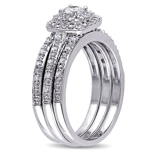 This gorgeous Loveblooms™ sterling silver 1/2ctw. diamonds bridal ring set features an engagement ring with a round white center stone and side stones. The set is completed with two high polished diamond studded wedding bands.