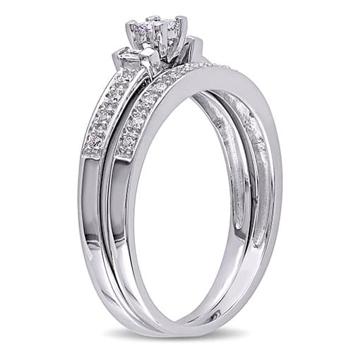 Description This stunning Loveblooms™ white gold 1/3ctw. diamond bridal ring set features a princess cut white diamond center stone with parallel baguette and round cut white...