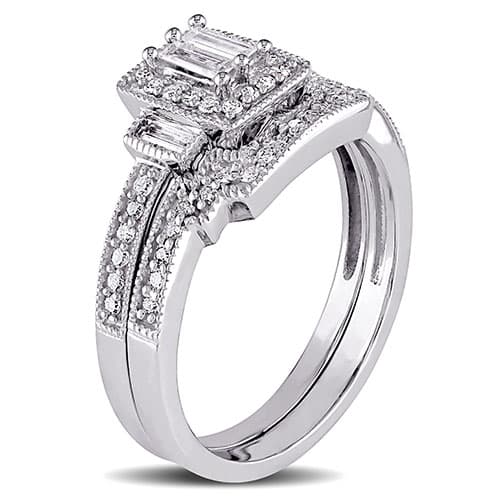 Description This stunning Loveblooms™ 10kt. white gold 2/5ctw. diamond bridal ring set features a parallel baguette style that is accented with round diamonds. Both are set in...