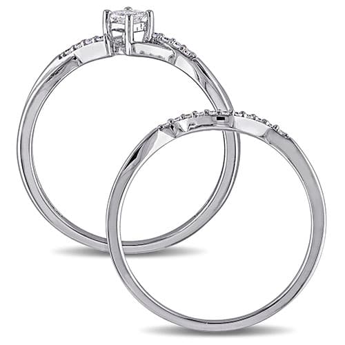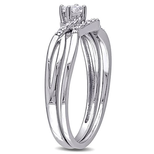 Description This Loveblooms™ sterling silver 1/5ctw. princess and round diamond bridal ring set features a princess-cut white diamond center stone with round white diamond side...