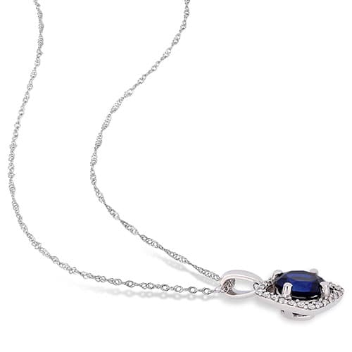 Description This Gemstone Classics™ necklace is crafted in 10kt. white gold and features a solitaire 1.00ctw. blue sapphire stone in a unique floating 1/10ctw. 20 diamond halo...