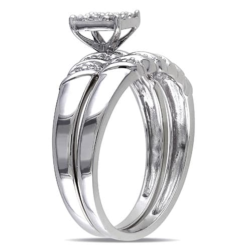 This Loveblooms™ sterling silver 1/10ctw. round diamond bridal ring set features round and parallel baguette-cut white diamonds in the center of the engagement ring. The set is complemented by a beautiful sterling silver band and these dazzling rings are enhanced with a high polish finish.
