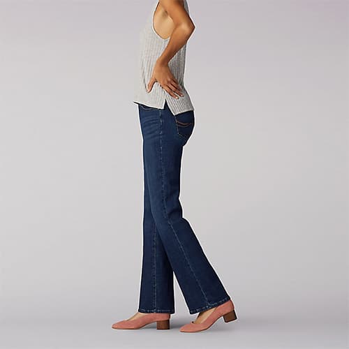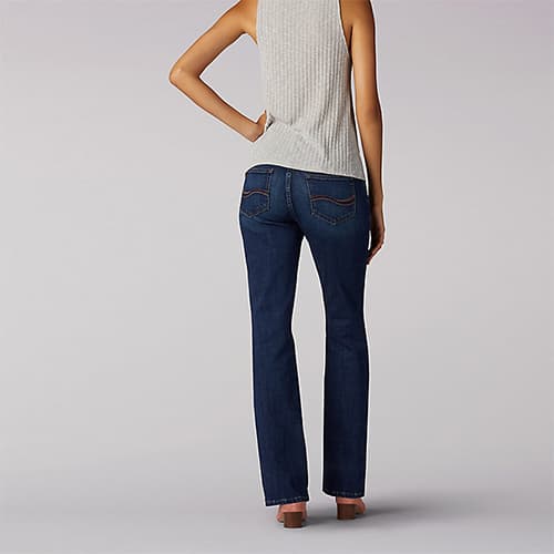 Womens Lee® Flex Motion bootcut mid-rise jeans offer a regular fit with a flexible waistband. The everyday stretch style features 5-pockets with detailed stitching, belt loops, and the classic button front with zip fly closure.