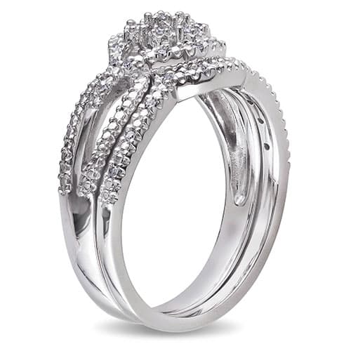 This stunning Loveblooms™ sterling silver 1/7ctw. diamonds bridal ring set features a gorgeous engagement ring with a composite of diamonds in the center and round white diamond side stones. The set is complemented by a beautiful contour wedding band and these lovely rings are crafted of fine sterling silver and glimmer with a high polish finish.