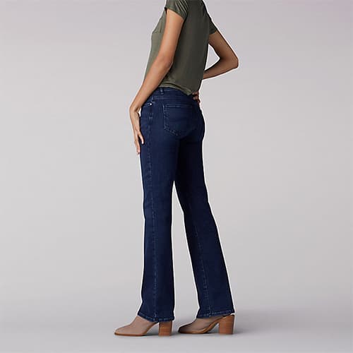 Womens Lee® Flex Motion bootcut mid-rise jeans offer a regular fit with a flexible waistband. The everyday stretch style features 5-pockets with detailed stitching, belt loops, and the classic button front with zip fly closure.