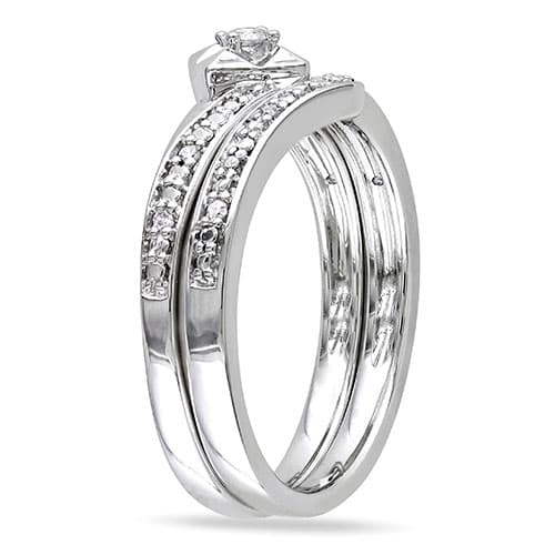 This stunning Loveblooms™ sterling silver 1/5ctw. round diamonds bridal ring set features a round white diamond center stone with pave-set diamond side stones set in sterling silver. They are finished with a high polish.