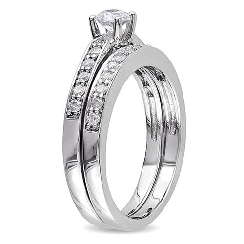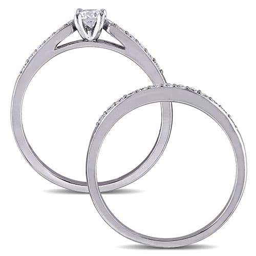 This stunning Loveblooms™ sterling silver 1/2ctw. diamonds bridal ring set features an engagement ring with a round white diamond center stone adorned with round white diamond side stones. This stunning set is complemented by a beautiful contour wedding band and the rings are crafted of fine sterling silver with a highly polished finish.