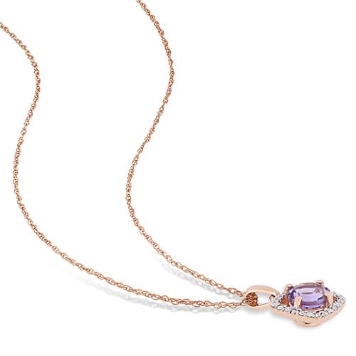 This Gemstone Classics™ necklace is crafted in 10kt. rose gold and features a solitaire 5/8ctw. amethyst stone in a unique floating 1/10ctw. 20 diamond halo design.