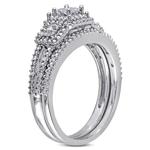 This stunning Loveblooms™ sterling silver princess and round 1/4ctw. diamond bridal ring set features a finely designed diamond engagement ring with a gorgeous diamond studded contour wedding band. Both rings are crafted of sterling silver and enhanced with a miligrain finish.