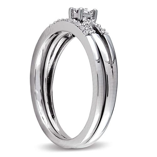 This gorgeous Loveblooms™ sterling silver 1/5ctw. princess and round diamond bridal ring set features a stunning engagement ring with a princess-cut white diamond center stone and round diamond side stones. This matching set also includes a beautiful wedding band and both rings are crafted of sterling silver, enhanced with a high polish finish.