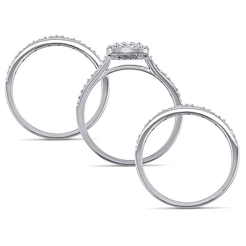 This stunning Loveblooms™ white gold 1/3ctw. diamond bridal ring set features an eye catching cluster style that is complemented with two beautiful semi-eternity wedding bands. Each ring is finely crafted in 10kt. white gold and enhanced with a high polish finish.