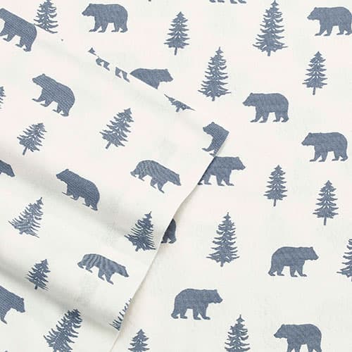 This Eddie Bauer bears and trees flannel sheet set adds an extra layer of warmth to your bedding ensemble! The set features graphic silhouettes of bears and evergreen trees arranged in a stylized foulard and a woodland feel. The denim blue motifs are softened with a twill texture that lends a woven impression to the flannel print. 100% Cotton. Machine wash cold. Tumble dry low.