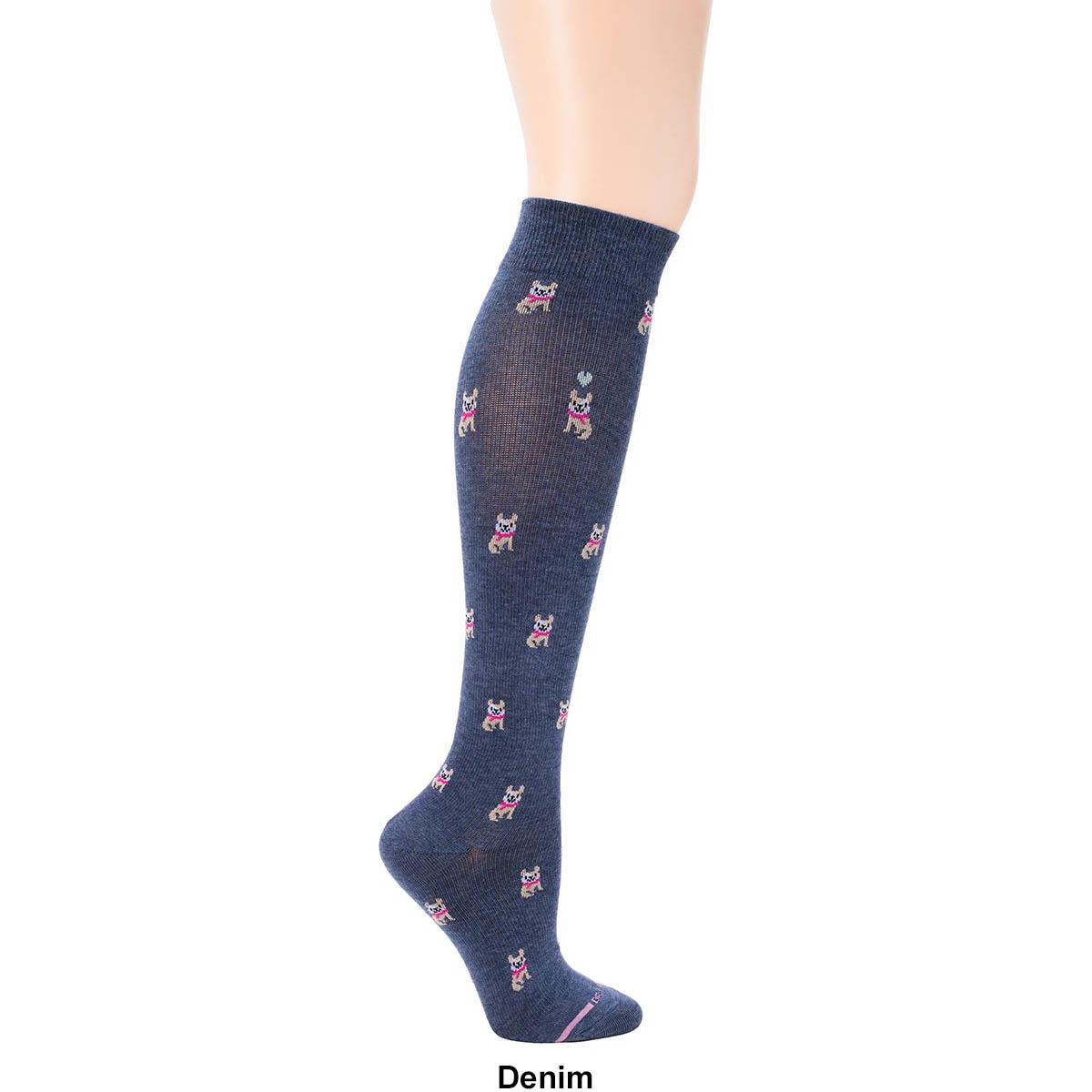 Womens Dr. Motion compression French bulldog knee high socks relieve tired, aching legs and feet while providing circulation and minimize swelling. 57% Nylon, 23% Cotton, 14% Acrylic, 6% Spandex. Machine wash. Tumble dry.