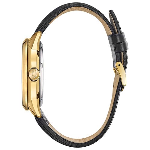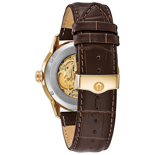This Mens Bulova gold-tone skeleton dial leather strap watch showcases a full exhibition dial and case-back. It features a gold-tone stainless steel screw back case, a skeletonized silver white three hand dial that reveals intricate workings of the self-winding 21 jewel movement, domed mineral crystal, and a brown leather strap with push-button deployant buckle. This piece is water resistant to 30 meters. Case Dimensions: 43mm.Style 97A138.Limited Manufacturer´s Warranty.