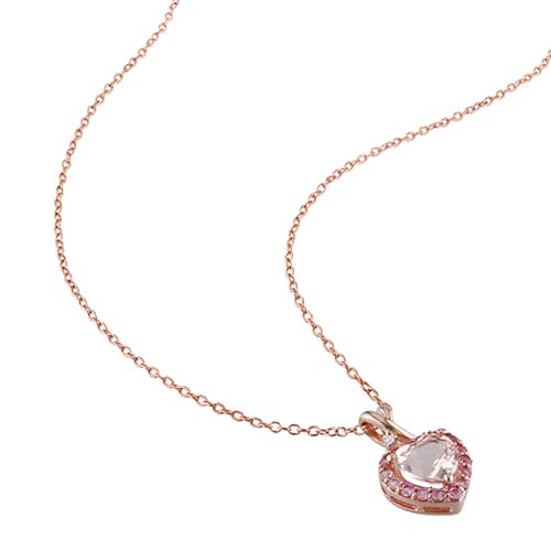 This adorable Gemstone Classics™ rhodium silver diamond accent and 1 1/3ctw. Morganite heart tourmaline heart pendant with chain necklace features heart shaped Morganites accented by pink tourmalines and a single white diamond. The pendant is set in rose rhodium plated silver and is complete with a matching chain.
