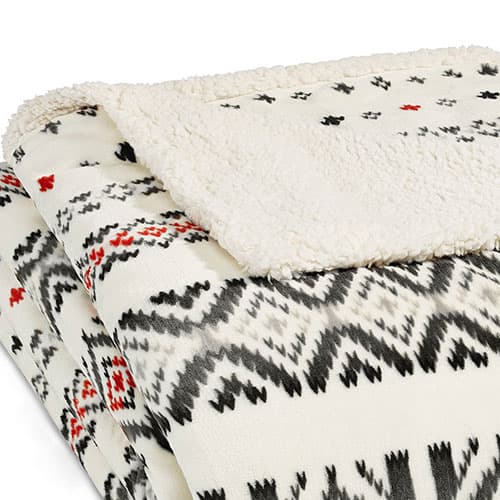 Description This Eddie Bauer Mountain Village chili Sherpa blanket will add a mountainside-chic look to your décor. The plush diamond and stripe pattern over a beige background...