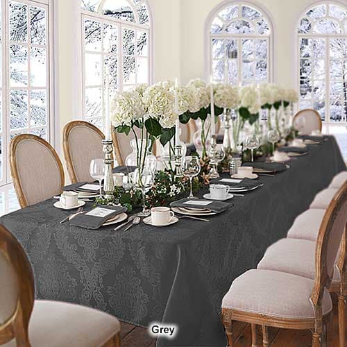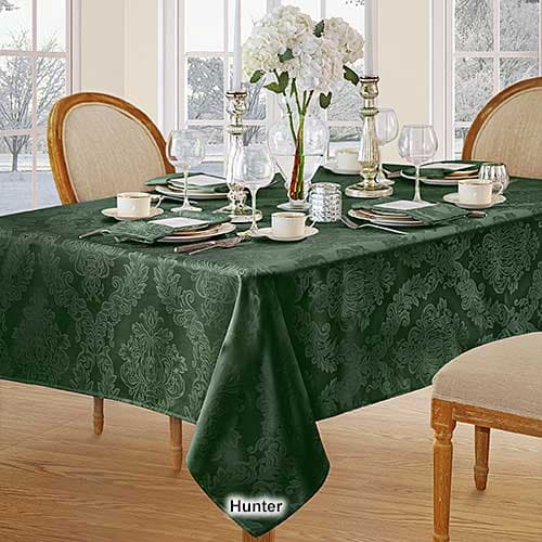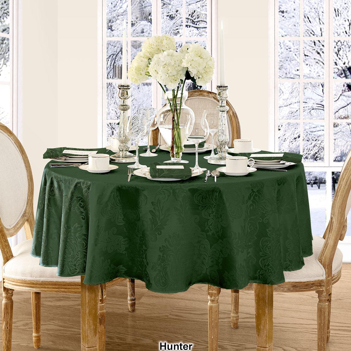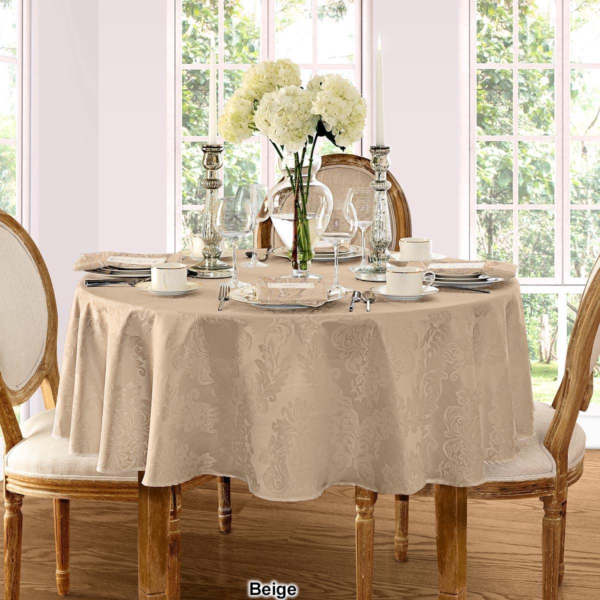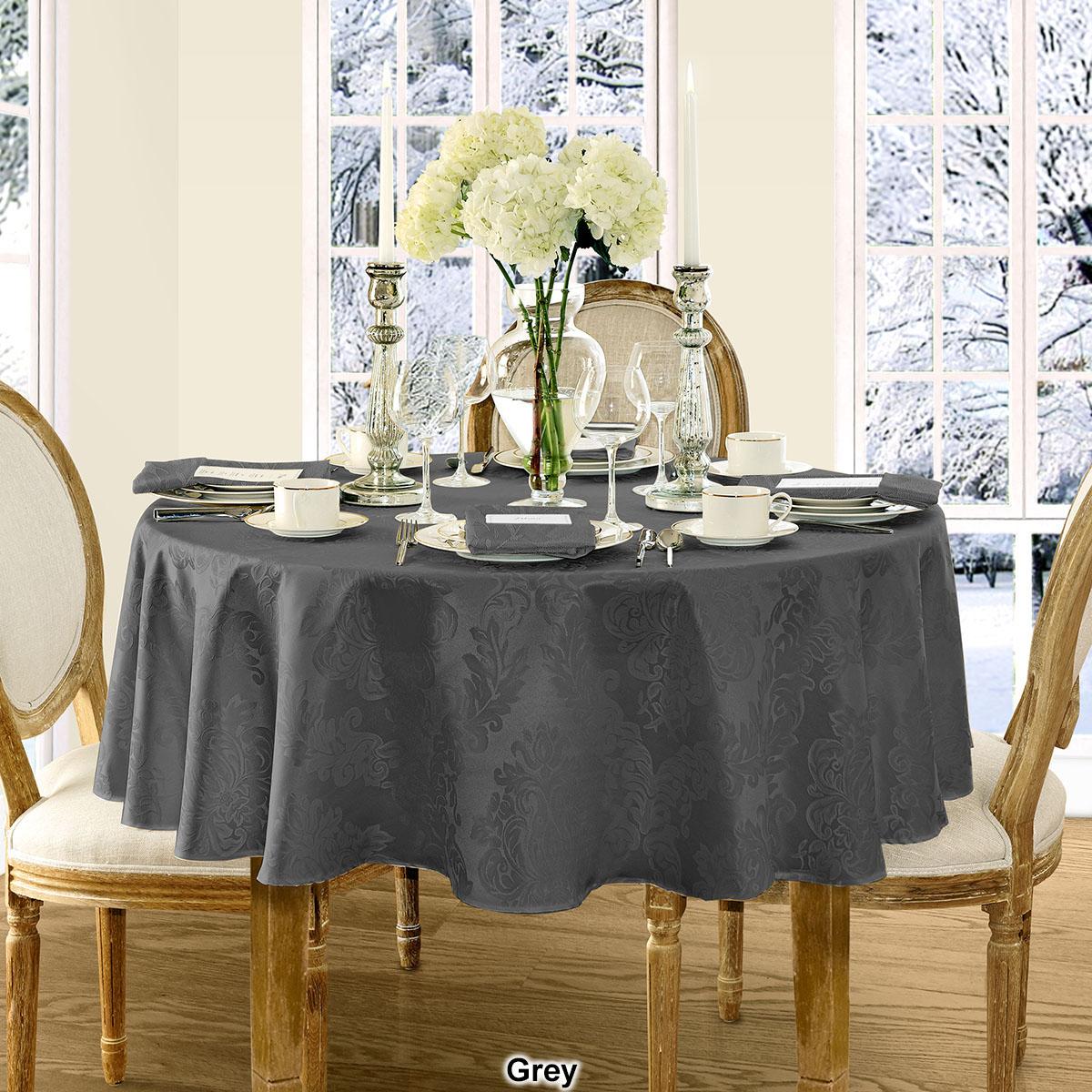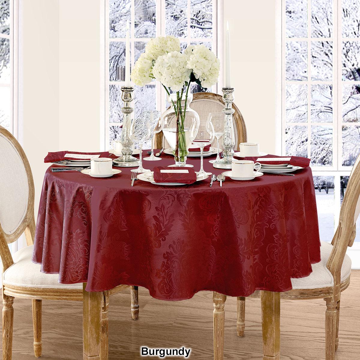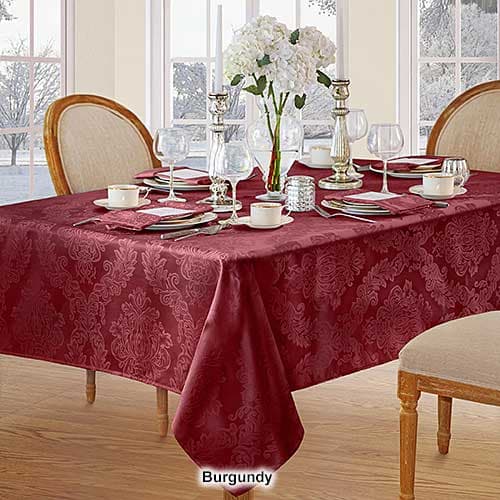This Elrene Barcelona damask tablecloth will suit any room décor. It features an allover regal damask design and is stain and water resistant.