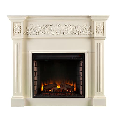 This Southern Enterprises Calvert carved electric fireplace features energy efficient LED and requires no professional installation, making it a cost effective way to upgrade your living or media room. The fluted side columns and an elegant floral design across the mantel draw attention to this classic, electric fireplace. This beautiful mantel is finished off with understated molding that complements the design fabulously. The firebox has realistic, multi-color flickering flames and glowing embers with an interior brick design for a more lifelike look. There is an easy to use remote control that offers a 4 way adjustability to warm the room conveniently. The safety features include automatic shutoff and glass that remains cool to the touch. Turn off the heat to enjoy the fireplace ambiance year round!