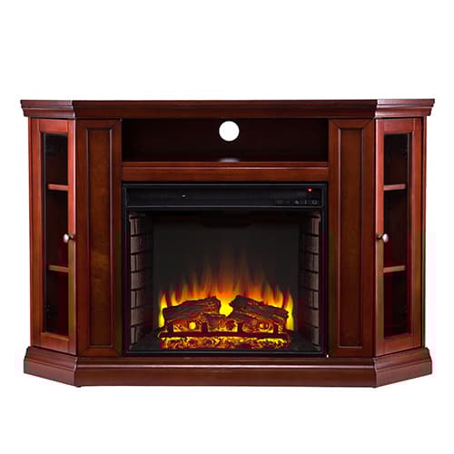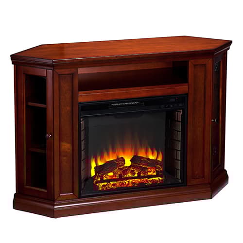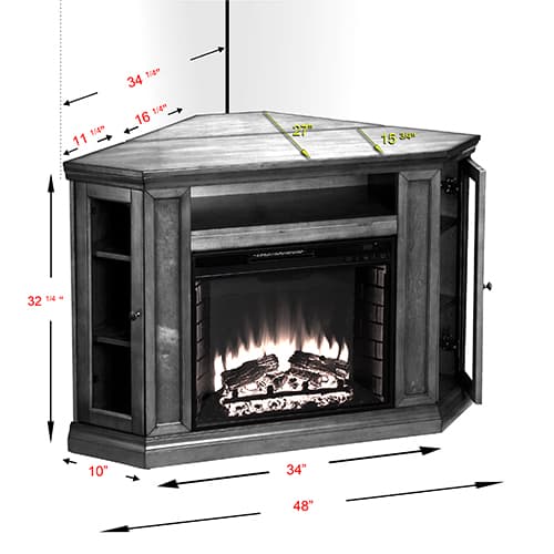 Easy to use remote control offers 4-way adjustability to warm the room conveniently. Supplemental heat for up to 400 square feet. Features 1 media shelf, 2 triangular side cabinets, and 4 adjustable side shelves. Offers 1 cord management opening. Remote control adjusts thermostat, timer, logs, and flames separately with ease. Safe, self-regulating heater turns off when desired temperature is met. Child safety lock accessible from remote control. Conveniently plugs into standard wall outlet with 6 Foot cord. Long life, energy-efficient LED bulbs. Temperature ratings: 62-82 degrees at 4 degree intervals. Heating/power: 120V/60Hz, 1500W, 12.5 Amps. Batteries: 1 CR2025, included. Materials: Poplar, MDF, Particle Board, Basswood Veneer, 4mm Tempered Glass, Metal, Resin, and Glass. Overall dimensions: 32.25”H x 48”W x 15.75”D.Limited Manufacturer´s Warranty.This item requires oversize delivery. Please refer to the Order Summary in the Shipping step at checkout for delivery charge.