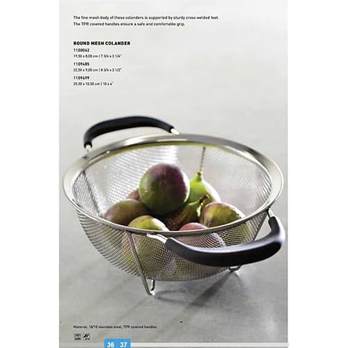 This BergHOFF Essentials 10 inch, round mesh colander features a stainless steel body, with fine mesh for fast drainage of both large and small foods. It is supported by sturdy cross welded feet which provide this colander with a solid base. No need to worry about draining hot food items thanks to the TPR covered handles that stay cool to ensure a safe and comfortable grip.