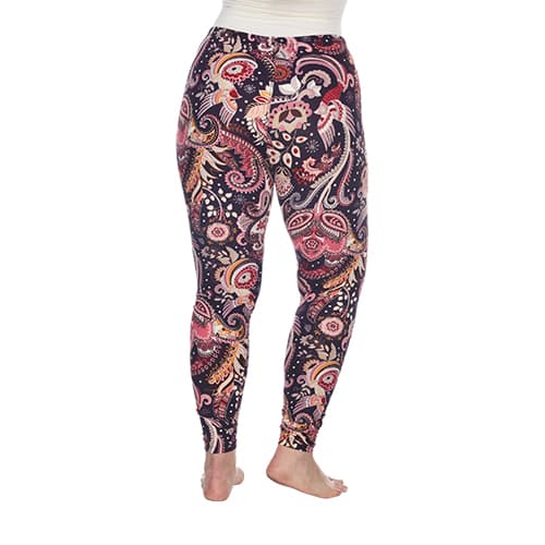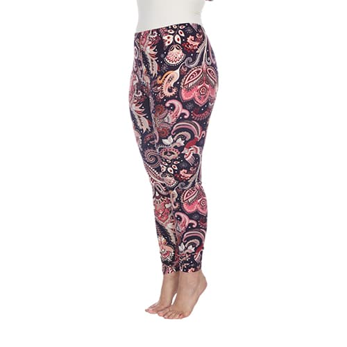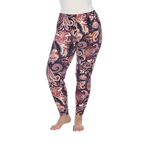 Pair these Plus Size White Mark purple and fuchsia paisley printed leggings with a top and any shoes for a simple, casual look. Made from a spandex and polyester blend, these leggings are comfortable and soft against the skin. Fits sizes 12-20, inseam 28´. 100% Polyester. Hand wash, hang dry.