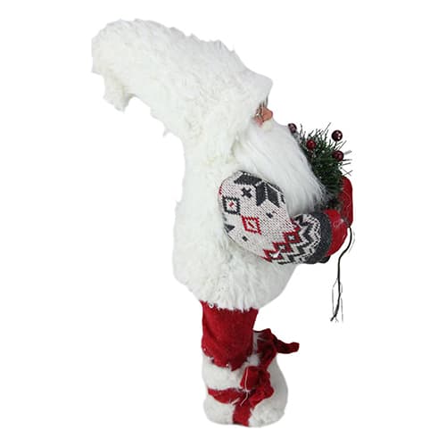 This Northlight Seasonal 12 inch Nordic Santa Claus Christmas décor is bundled up in his wool hat, vest, and boots. He is shown holding a sack in his arms that is filled with frosted pine branches and berries. This piece is handmade with exceptional attention to detail.