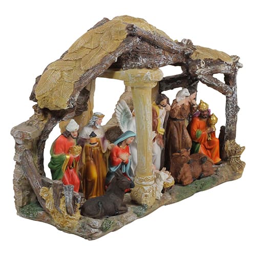 This Northlight Seasonal 18 inch traditional religious led Christmas nativity with stable house decoration features a rich color palette and gold details. It includes Mary, Joseph, Baby Jesus, an Angel, the Three Kings, a shepherd, cow, donkey and lamb. It is pre-lit with LED lights and all figures are attached to the stable house. Baby Jesus is not removable from the manger. Requires 2 AAA batteries (not included).