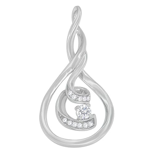 This Espira 10kt. white gold 1/8ctw. diamond layered spiral pendant necklace showcases a wide outer ring that beautifully surrounds a cascade of diamonds on a spiral inside. Stone color: l-J. Clarity: I1-I2.