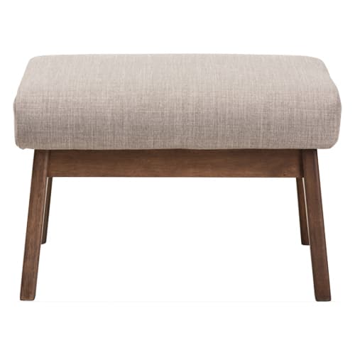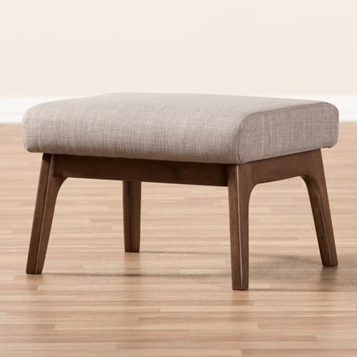 This Baxton Studio Bianca ottoman will bring plush comfort into your home with the vintage style. It has exceptional durability, stable comfort and is upholstered in cool light grey polyester fabric to give it an updated look. It is perfect for a modern or minimal interior and features smooth angular solid wood frame in dark walnut finishing for a nod to mid-century modern design that exudes warmth. Spot clean only. Made from 100% Polyester and Rubber Wood. Dimensions: 15.4”H x 22.6”W x 18.5”D.