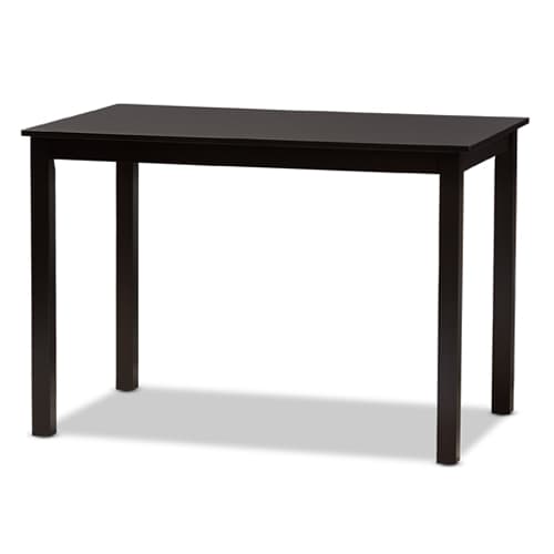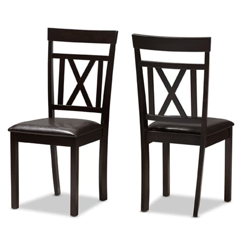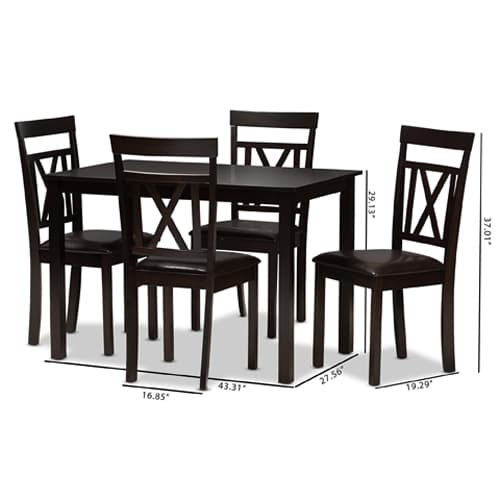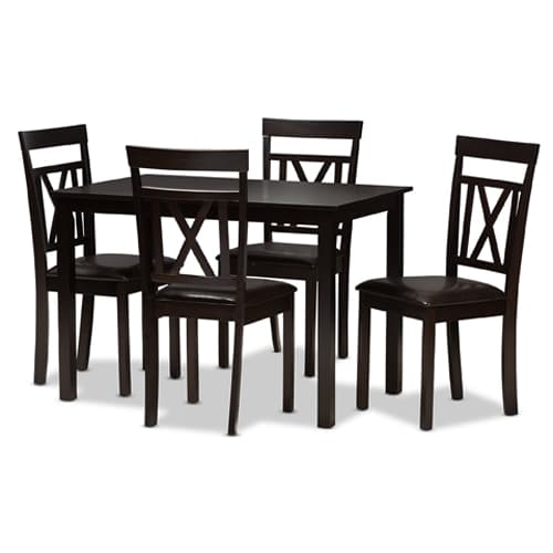 This Baxton Studio Rosie 5 piece dining set is modern and contemporary and celebrates simplicity by combining timeless and contemporary elements. The chairs’ high, X-back design offers comfort and grace and the table’s understated smooth, rectangular top represents refinement. They have a dark brown, wenge finished wood that matches perfectly with the dark brown faux leather padded seats. The table and chairs share square tapered legs for a modern essence.