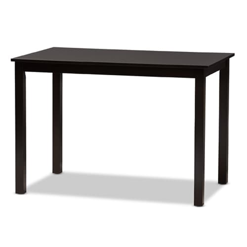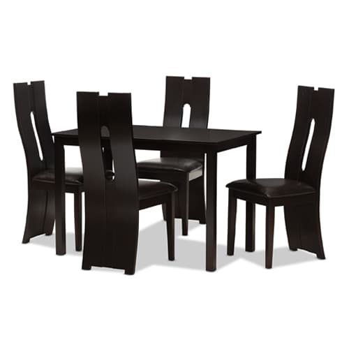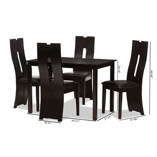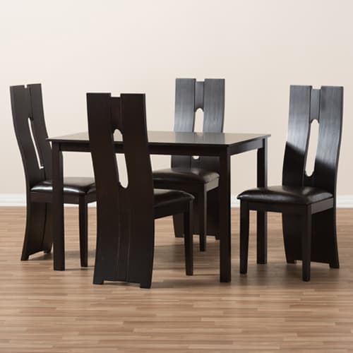 This Baxton Studio Alani 5 piece dining set excites and delights for a truly enjoyable dining experience. This set features an impressive extra tall backrest with padded faux leather seats in dark brown. The chair features an eye catching cut out shape on its bent backrest as an added contemporary style. They are finished with dark brown finishing for a contemporary look.