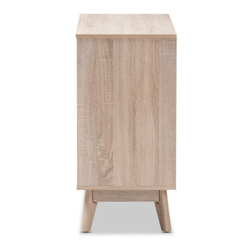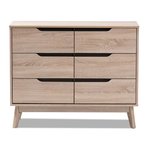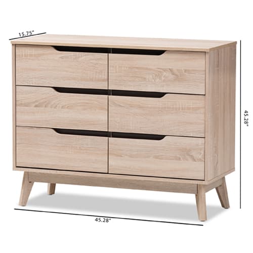 This Baxton Studio Fella 6 drawer dresser is a perfect blend of classic and modernity and showcases a pattern played with clever balance of colors and sleek surface. The angled legs complement this piece of furniture for superior support and style. There are 6 drawers that open to reveal storage room for linens and clothes. With practicality, the inset handles in grey wood finish contrasts with the oak surface for a contemporary, Scandinavian aesthetic in your home. Wipe with a soft dry cloth to clean. Made from Particle Board and MDF with PU Paper. Dimensions: 23.7”H x 39.4”W x 15.8”D.