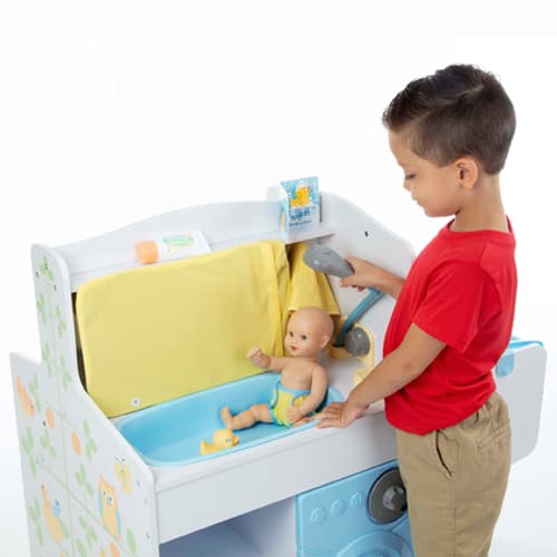 Description This Melissa & Doug® Doll Care play center is a multi-functional doll and stuffed animal baby care activity center that has everything kids need to nurture and play...
