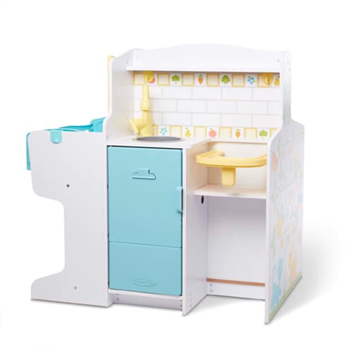 This Melissa & Doug® Doll Care play center is a multi-functional doll and stuffed animal baby care activity center that has everything kids need to nurture and play with their special babies. The sturdy wooden center includes a kitchen with a refrigerator, sink, and high chair. A changing and bathing area features a bathtub with spray nozzle and flip down changing mat, a mirror, wipes dispenser, diaper disposal, and washing machine with clicking dial. The nursery area has a rocking cradle, clothing storage, and shuttered window with a card that can be flipped to a daytime or nighttime scene. Spot clean only.