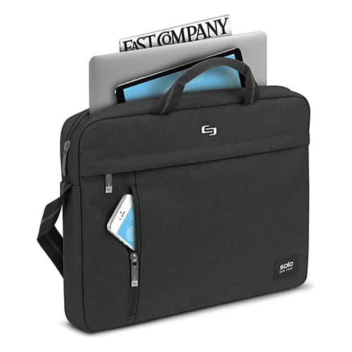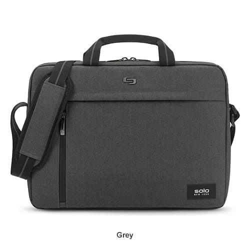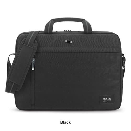 Description This Solo Rivington slim briefcase is a stylish piece. It features a fully padded 15.6 inch laptop compartment, zippered front pockets, and adjustable shoulder straps...