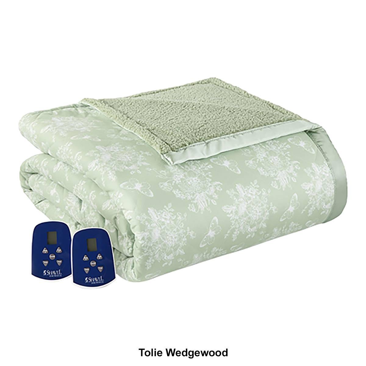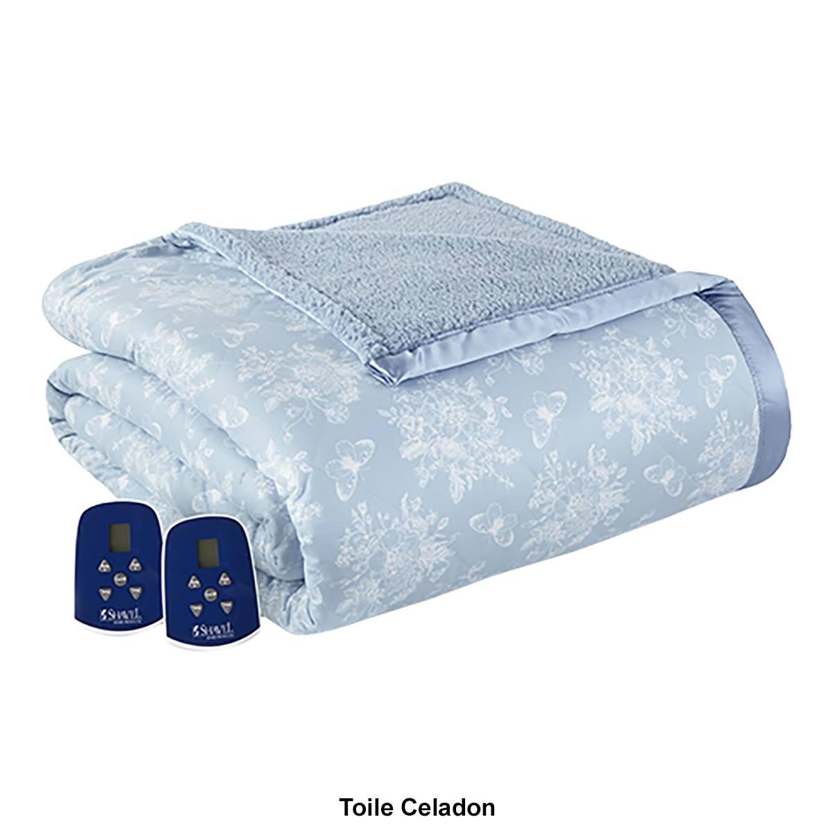 The Micro Flannel® Reverse to Sherpa toile heated blanket has 6 layers of down alternative fiber, soft wire heating technology, 2 insulating layers, plus Micro Flannel® and Sherpa on front and back! It showcases Tac-tite® quilting that prevents shifting wires with a stylish satin hem that finishes the look. The blanket has 8 secure heat settings with large number "Easy to Read, Easy to Use"™ controllers, 10 hour auto shut-off, and 16 foot cords.Limited Manufacturer´s Warranty.