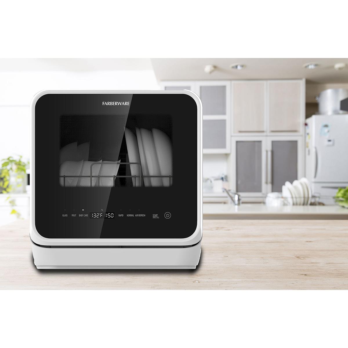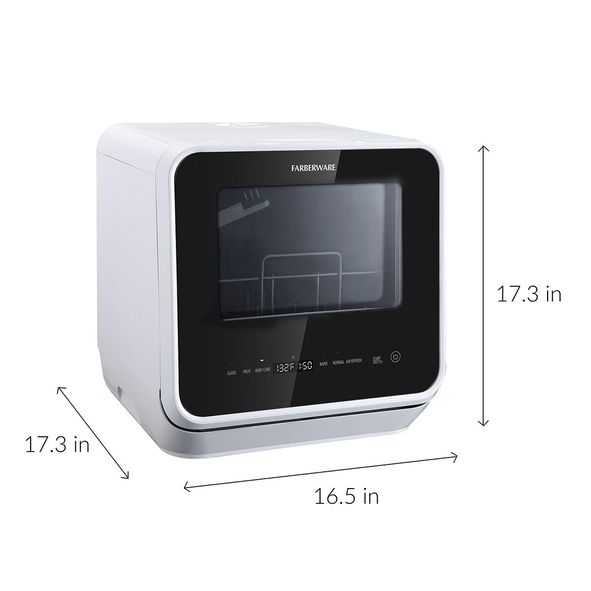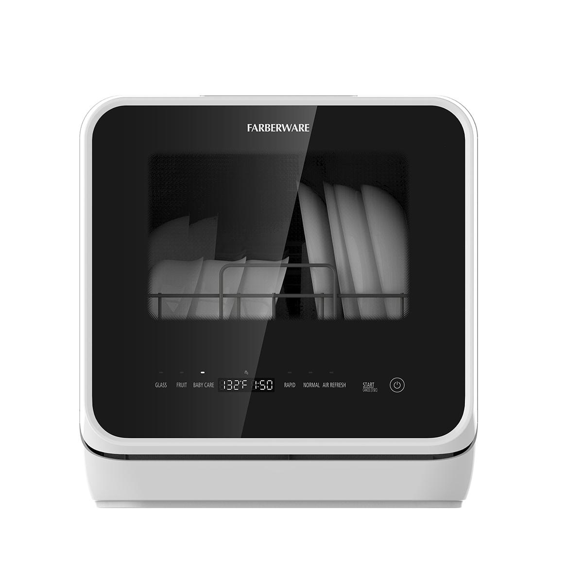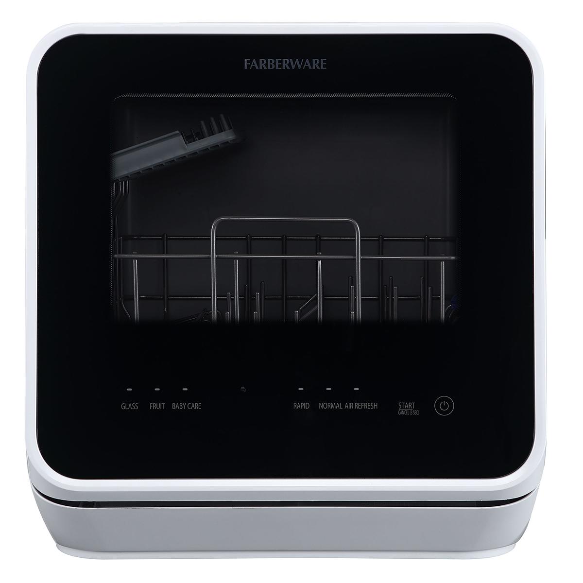 If you have electricity, water, and 40 minutes, you can clean your dishes anywhere and anytime! Whether it´s camping, on your boat, RV, in your kitchen, dirty dishes are a thing of the past. The Farberware® Professional dishwasher can be placed on any countertop or sturdy table and gives you the choice of using its built-in water tank or a quick faucet hookup. It offers 3 different wash cycles and can also be used to steam-clean baby bottles.This item requires oversize delivery. Please refer to the Order Summary in the Shipping step at checkout for delivery charge.Model: FDW05ASBWHA
