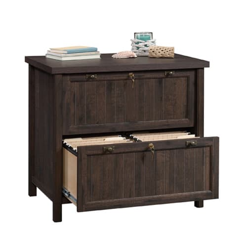 Sauder Costa lateral file features a durable 1" thick top, and drawers with full extension slides hold letter or legal size hanging files. The patented, interlocking safety mechanism allows only one drawer open at a time, keeping you and your family safe. Drawers lock for secure storage. Framed, slat-front detailing for an added touch of style. Coffee Oak finish.Please measure to make sure it will fit in your space.This item requires oversize delivery. Please refer to the Order Summary in the Shipping step at checkout for delivery charge.