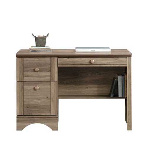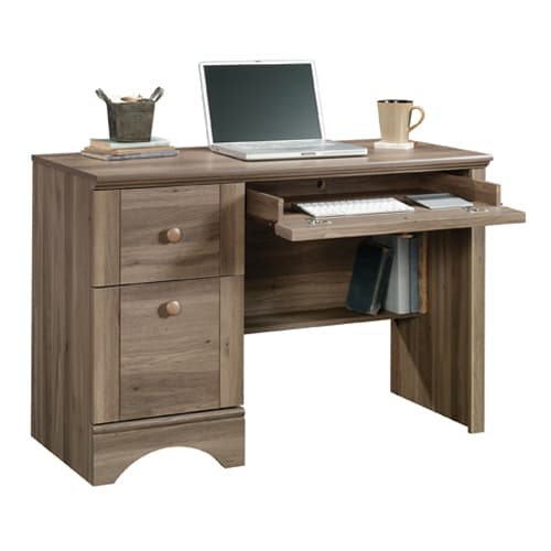 Sauder Harbor View computer desk features a large drawer/shelf with metal runners and safety stops features flip-down panel for keyboard/mouse. Two drawers with metal runners and safety stops feature patented T-lock assembly system to save you time.