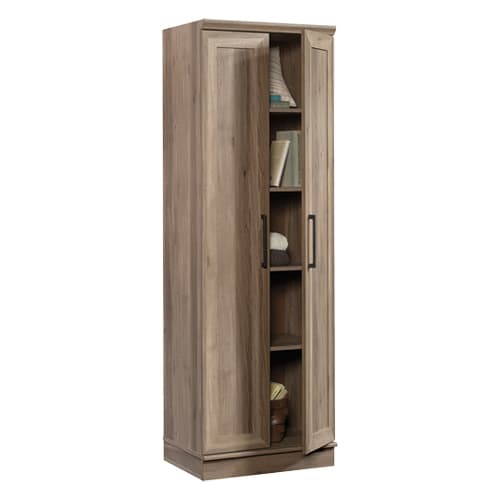 Sauder Homeplus storage cabinet features four adjustable shelves, framed panel doors, and an enclosed back panel has cord access. Adjustable base levelers. Salt Oak finish.